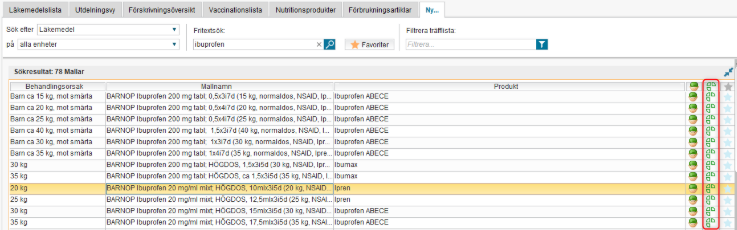 När ett läkemedel eller en ordinationsmall söks fram kan man se om det ingår i ePeds rimlighetskontroll genom att titta i kolumnen för ePed.