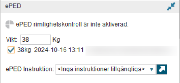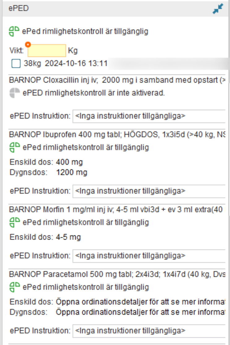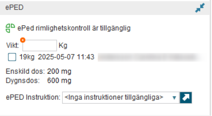 - Till höger i den administrativa vyn syns ePed-panelen för de läkemedel som ingår i ePed. Här anges patientens vikt. Vikt är en obligatorisk uppgift för alla läkemedel som ingår i ePed och ordinationer kan inte signeras om inte vikt anges antingen i ePed-panelen eller i Ordinationsdetaljer. Efter att vikt angetts kan rimlighet för enskild och/eller dygnsdos kontrolleras.
