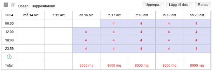 - Kontrollera schemat för att se om enskild och/eller dygnsdos avviker från rimliga intervall. Svart text visar att dos ligger inom rimligt intervall.
