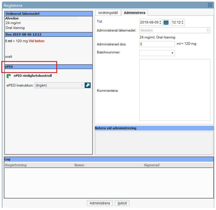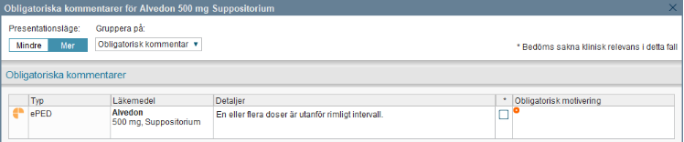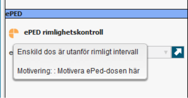 - Om en ordination signeras trots att doseringen ligger utanför rimligt intervall kommer en varningsruta där man behöver ange en obligatorisk motivering. Motiveringen är information till administrerande sjuksköterska och ska förklara varför dosen är signerad trots varning enligt ePed.