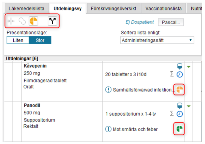 ePed-ikonen visas tillsammans med övriga varningsikoner i Utdelningsvy när minst en ordination med ePed är gjord. Ikonen är en samlingsikon som styrs utifrån sämsta scenariot. Det innebär att om det finns en ordination med gul ikon, så blir samlingsikonen gul.