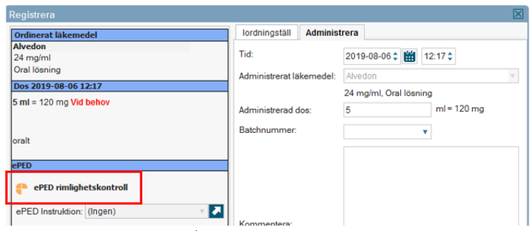 - Vid ändring av administrerad dos sker ingen ny rimlighetskontroll. För att uppmärksamma sjuksköterskan på detta visas en blå informationsring vid administrerad dos. Tooltip över informationsringen säger: ”Den här behandlingen har kontrollerats och signerats med hjälp av ePed rimlighetskontroll. Var därför försiktig med dosändringar.”