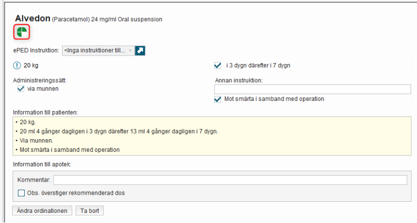 - Kontrollera förhandsgranskningen. Fylld ePed-ikon visar att validering har gjorts. Grön ikon visar att dosering är inom rimligt intervall, gul ikon visar att dosering är utanför rimligt intervall.