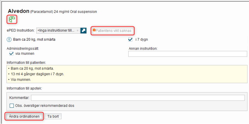 Om en vikt inte är angiven för ordinationen är ePed-ikonen inte ifylld och en text anger att patientens vikt saknas.