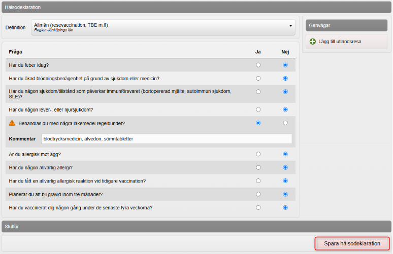 Hälsodeklarationen är nu sparad och finns tillgänglig när ordinatören ska ordinera.