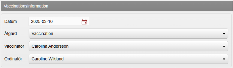 4. Under Vaccinationsinformation: Dagens datum är förvalt. Ändra till korrekt vaccinationsdatum. Välj Åtgärd Vaccination och välj Vaccinatör och Ordinatör.