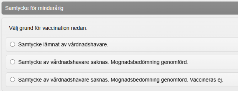 5. Om patienten är minderårig, ange Samtycke för minderårig. Alternativen är olika beroende på barnets ålder. Markera aktuellt alternativ.