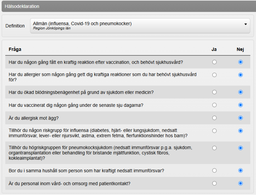 6. Under Hälsodeklaration: Välj aktuell hälsodeklaration och fyll i svaren. Efterregistrerar du en vaccination som är ordinerad i annat system (t.ex. Cosmic) väljer du hälsodeklaration ”Registrering av vaccin från annat system”, svarar Ja och skriver i Kommentar i vilket system vaccinationen finns dokumenterad.