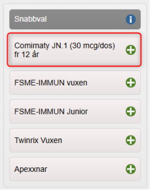 7. Under Vaccin: Välj vaccin i vallistan Vaccin och klicka på Lägg till alternativt välj vaccin under Snabbval till höger om vaccinet finns tillgängligt där. Upprepa om fler vaccin ska läggas till.