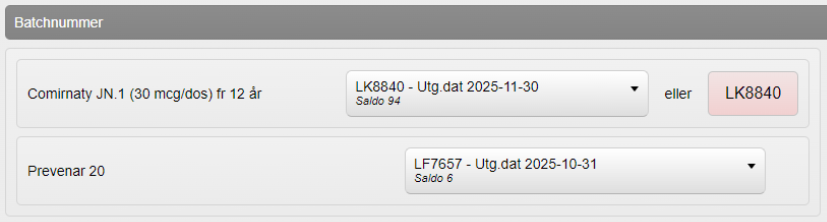 9. Under Batchnummer: Välj batchnummer. Ibland finns även en snabbknapp med tidigare använt batchnummer som du kan använda om det är rätt batchnummer.