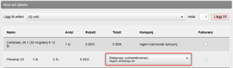 10. Under Varor och tjänster: Detta fält används för att ange om vaccinet ska subventioneras eller inte (gäller endast vaccin mot influensa och pneumokocker). Riskgrupp (subventioneras) är förvalt. Ändra till Ej riskgrupp (ingen subvention) om patienten själv ska betala för vaccinet.