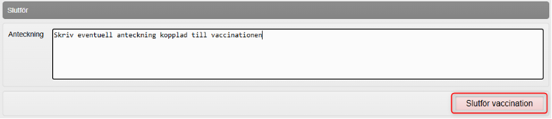 11. Under Slutför: Skriv vid behov en anteckning kopplad till vaccinationen och klicka på Slutför vaccination för att slutföra registreringen.