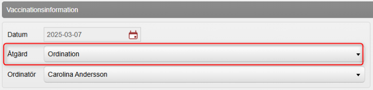3. Under Vaccinationsinformation: Välj Åtgärd Ordination (förvalt för Läkare) och byt Ordinatör om det är någon annan än dig själv som ska stå som ordinatör. Vaccinationen hamnar då i ordinatörens signeringslista när den är slutförd. OBS! Urvalet i rullisten är de användare på enheten som har behörigheten ”Läkare” eller ”Sjuksköterska med ordinationsrätt” och tar inte hänsyn till om användarna är behöriga att ordinera aktuellt vaccin eller inte.