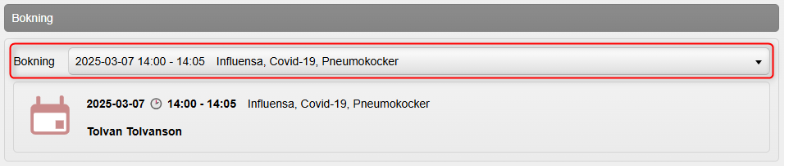 4. Om det finns en aktuell bokning visas fältet Bokning. Om vaccinationen inte ska kopplas till bokningen, välj Ingen i vallistan Bokning.