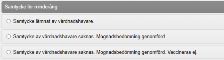 5. Om patienten är minderårig måste du även ange Samtycke för minderårig. Valen är olika beroende på barnets ålder. Markera aktuellt alternativ.
