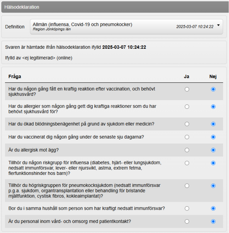 6. Under Hälsodeklaration: Välj aktuell hälsodeklaration under Definition om den inte redan är förvald. Besvara frågorna alternativt granska svaren om den redan är ifylld.