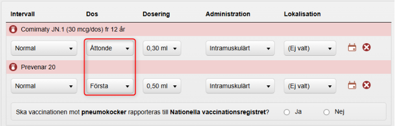 8. Välj Dos och ändra vid behov övrig information. Lokalisation behöver inte anges. Det anges i samband med vaccinationen.