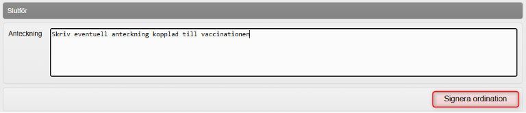 9. Under Slutför: Skriv vid behov en anteckning kopplad till ordinationen/vaccinationen och klicka på Signera ordination för att slutföra registreringen.