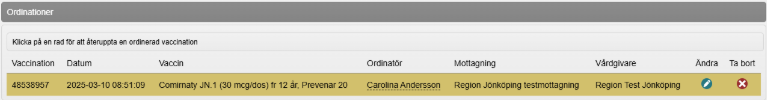 10. Vaccinet är nu ordinerat och ordinationen visas som en gul rad under Ordinationer i vyn Visa kund.