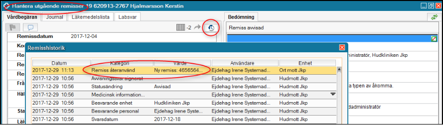 Om du öppnar den avvisade remissen genom att klicka på Hantera från Utgående remisser ser du i historiken att remissen är återanvänd.