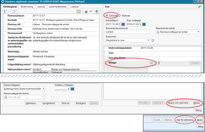 Om du är inloggad som vårdpersonal kan du vidimera direkt genom att klicka på knappen Spara och vidimera, och om du är inloggad som vårdadministratör heter knappen istället Klar för vidimering. I och med att du klickar på Klar för vidimering kommer svaret att läggas för vidimering hos den som står som Svarsmottagare för den skickade remissen.