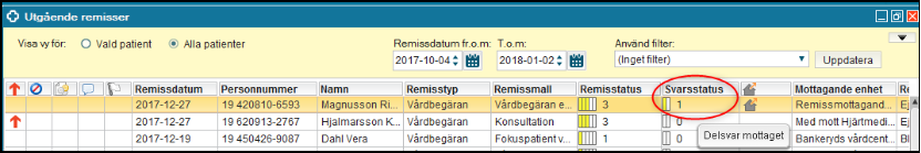 Observera att du ser remisser med Remissdatum 90 dagar tillbaka i tiden, och får välja ny datumperiod för att kunna se äldre remisser.