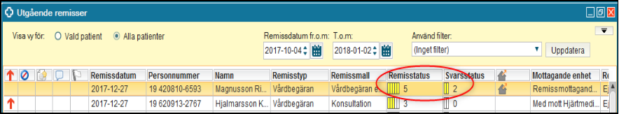 Du kan kontrollera att remissen ändrat Remisstatus och Svarsstatus i Utgående remisser. Det går inte att ändra i ett inregistrerat svar då remissen är i status 5 men det går att återöppna remissen för att lägga till ett nytt svar innan svaret är vidimerat. Tänk på att avsluta remissen igen!