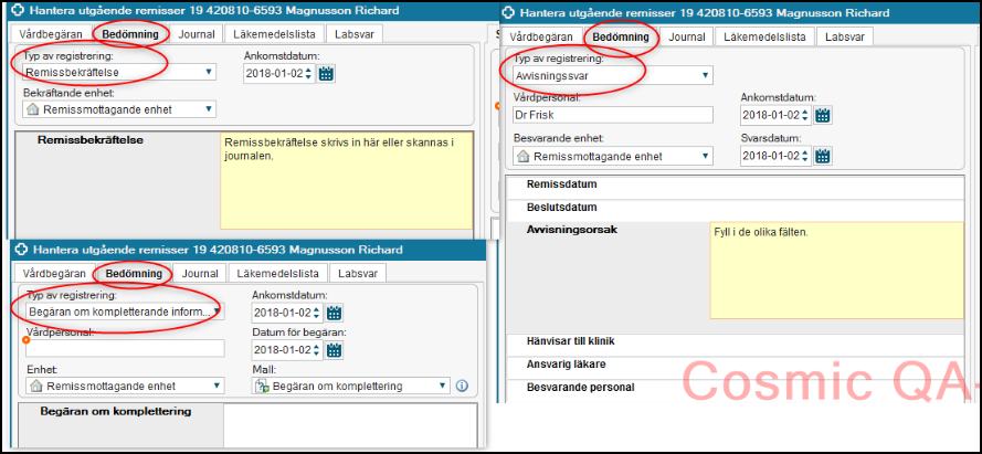 När remiss är skickad till enhet utanför Cosmic kommer ibland remissbekräftelse/Avvisnings-svar och Begäran om kompletterande information i pappersform.