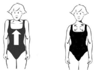 B. Vidga bröstet genom att mjukt dra ihop skulderbladen - lättast med en inandning - slappna av – blås ut.