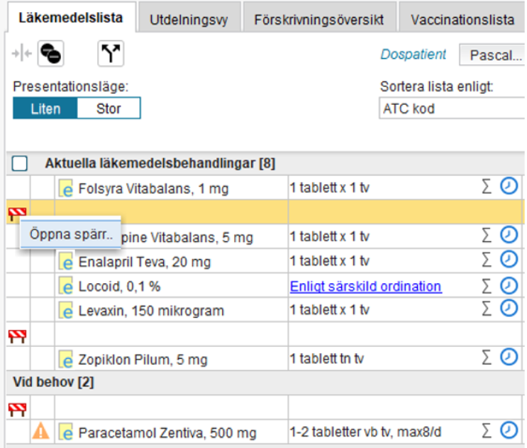Spärrade läkemedelsbehandlingar visas inte i Läkemedelslista. Spärrarna måste öppnas för att läkemedelsbehandlingarna ska visas. Inre spärrar kan öppnas genom att högerklicka på den spärrade läkemedelsbehandlingen i Läkemedelslista.