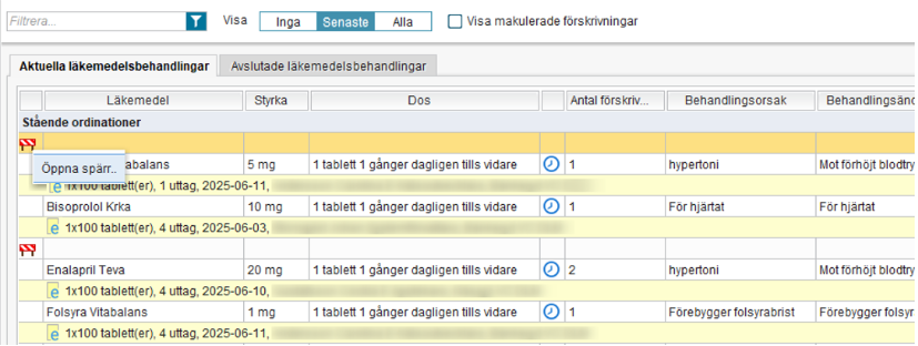 Spärrade läkemedelsbehandlingar visas inte i Receptöversikt. Spärrarna måste öppnas för att läkemedelsbehandlingarna ska visas. Inre spärrar kan öppnas genom att högerklicka på den spärrade läkemedelsbehandlingen i Receptöversikt.