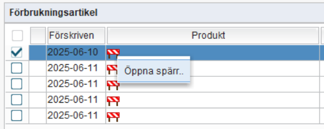 Spärrade förskrivna förbrukningsartiklar visas inte i Förbrukningsartiklar. Spärrarna måste öppnas för att recepten på förbrukningsartiklarna ska visas. Inre spärrar kan öppnas genom att högerklicka på det spärrade receptet i Förbrukningsartiklar.