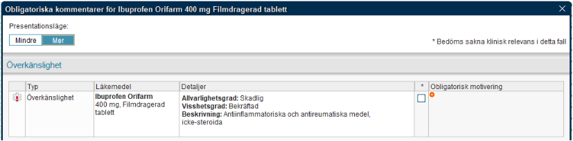 Om läkemedlet interagerar eller har samma ATC-kod som en spärrad läkemedelsbehandling omfattas även den spärrade läkemedelsbehandlingen i varningen men du kan inte se vilket läkemedel det rör sig om. För att se fullständig varningsinformation kan spärren öppnas genom att högerklicka på spärrikonen (inre spärr).