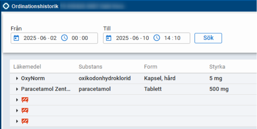 Spärrade läkemedelsbehandlingar visas inte i Ordinationshistorik. Spärrarna kan öppnas i Läkemedelslista (inre spärrar) för att läkemedelsbehandlingarna ska visas i Ordinationshistorik.