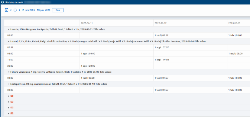 Spärrade läkemedelsbehandlingar visas inte i Utdelningshistorik. Spärrarna måste öppnas i Läkemedelslista (inre spärrar) för att läkemedelsbehandlingarna ska visas i Utdelningshistorik.