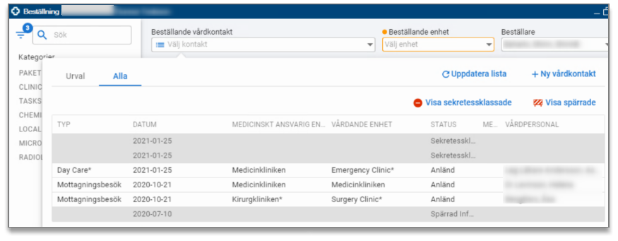 I vyn Beställning kan vårdkontakter väljas i listrutan Beställande vårdkontakt. De visas i ett dialogfönster där spärrade och sekretessklassade vårdkontakter presenteras med datum och status men övriga fält är tomma. En kontakt som är spärrad och/eller sekretessklassad kan aldrig väljas eller föreslås av systemet innan spärren och sekretessklassningen har öppnats.