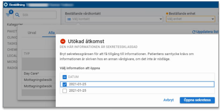 Dialogrutan Utökad åtkomst för sekretessklassade vårdkontakter.