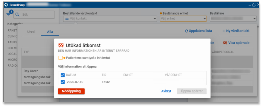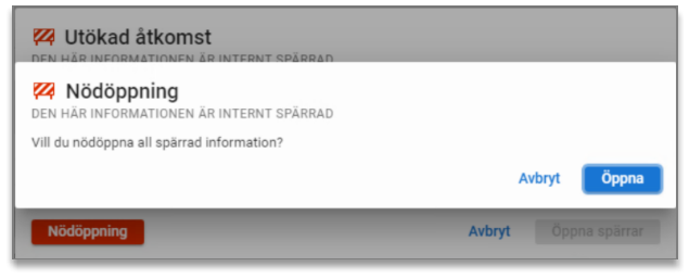 Nödöppning kan användas om man inte kan inhämta patientens samtycke eller om man akut behöver tillgång till alla vårdkontakter. I dialogrutan Utökad åtkomstklickar man på knappen Nödöppning som då öppnar alla vårdkontakter.