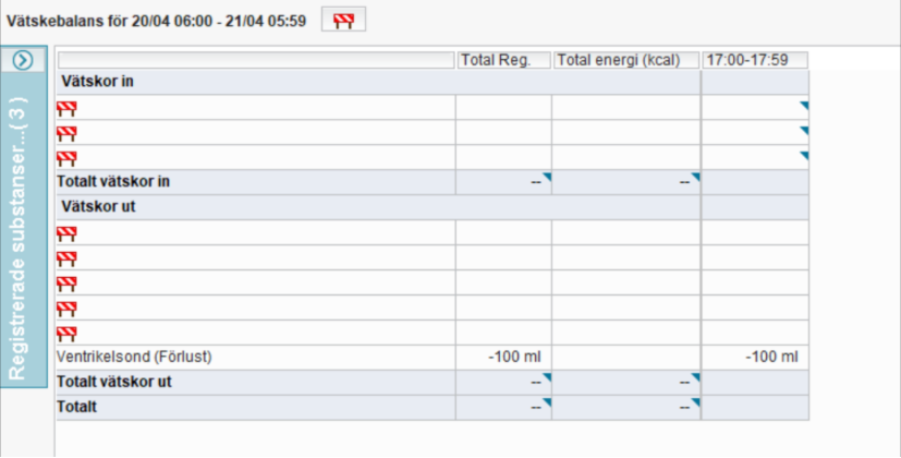 Spärrad information indikeras i vyn Vätskebalans och i dialogfönstret Logg. Ikonerna för inre respektive yttre spärr visas i tabellens rubrik, raden för aktuellt värde och i dialogfönstret för logg.