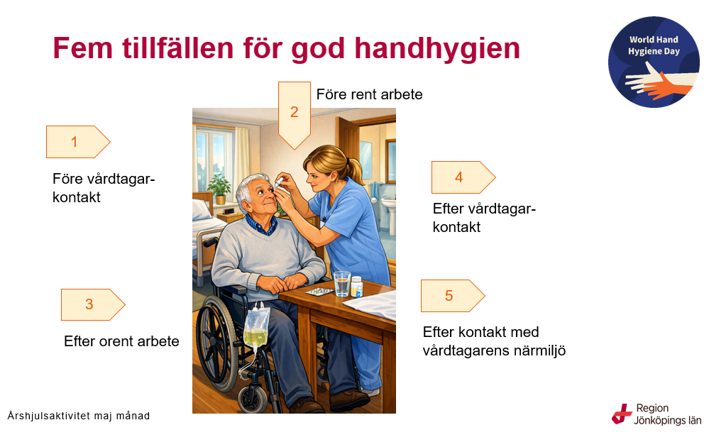 - Använd det material som Folkhälsomyndigheten och Socialstyrelsen tagit fram utifrån WHO:s tema för handhygienens dag 2026. Ladda ner affischer och grafik för att sätta upp i offentliga utrymmen och på andra ställen, samt att sprida i sociala medier. https://www.folkhalsomyndigheten.se/rena-hander-raddar-liv/handhygiendagen-5-maj/